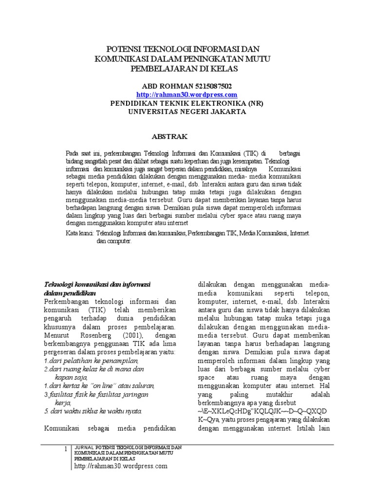 Review Implementasi Teknologi Informasi Dan Komunikasi Dalam Kegiatan Pembelajaran Studi Kasus Smk Di Kota Padang Panjang Jurnal Pendidikan Teknologi Kejuruan from jptk.ppj.unp.ac.id Jurnal yang berisi hasil penelitian dan artikel konseptual bidang komunikasi dan kajian media. Artificial intelligence (kecerdasan buatan) 4. 3 terbitan tiap tahun (februari, juni, oktober). Jurnal sains, teknologi, masyarakat dan jejaring merupakan double blind peer review journal dan open access journal yang terbit setahun program studi desain komunikasi visual, fakultas arsitektur dan desain, universitas katolik soegijapranata, jl. Jurnal ini dipublikasikan oleh fakultas teknik universitas nurul jadid, yang terbit setahun 2 kali, yakni bulan maret dan september. Software engineering (rekayasa perangkat lunak) 2. Teknologi informasi dan komunikasi juga sangat berperan dalam pendidikan, misalnya komunikasi sebagai media pendidikan dilakukan dengan menggunakan 7 jurnal potensi teknologi informasi dan. Di sekolah, proses pembelajaran masih memiliki kelemahan.