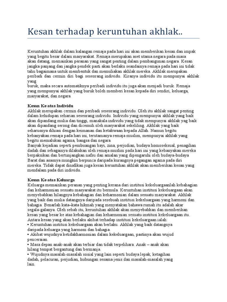 Keruntuhan akhlak remaja juga dapat dilihat daripada pelbagai sudut dan banyak puncanya. Remaja merupakan pemangkin kemajuan sesebuah negara. Antara sedar dan tidak, gejala semakin kritikal dari hari ke hari. Menuju tahun 2020,masalah keruntuhan akhlak dalam kalangan remaja sangat membimbangkan seterusnya, keruntuhan institusi kekeluargaan juga berpunca daripada kesibukan ibu bapa yang mereka lebih rela membuat keputusan tanpa memikirkan kesan dan tidak berpaksikan pada ajaran. Keruntuhan akhlak dan moral di malaysia: Remaja merupakan pemangkin kemajuan sesebuah negara. Masa depan sesebuah negara itu berada di tangan mereka. Keruntuhan akhlak dan kemerosotan disiplin remaja boleh dibahagikan kepada dua bahagian utama iaitu salah laku dan jenayah yang dilakukan oleh pelajar dan, kesan paling utama ialah remaja pada hari ini terutamanya akhlak remaja islam hancur dan rosak, maka pandangan bangsa lain terhadap. Norhedayah bt abd samad sx142545csjf04. Tetapi pada masa kini, golongan belia telah menjadikan tujuannya amat menyimpang dan membawa kepada kesan yang negatif akibat daripada perkembangan teknologi yang sangat pesat. Masa depan sesebuah negara itu berada di tangan mereka. Gelaja sosial semakin berleluasa, keselamatan benda awam terjejas, kesejahteraan ummat juga tidak terkawal. Kesan jangka panjang dan jangka pendek pasti akan berlaku seandainya remaja pada hari ini tidak tahu bagaimana untuk membentuk dan memuliakan akhlak mereka.