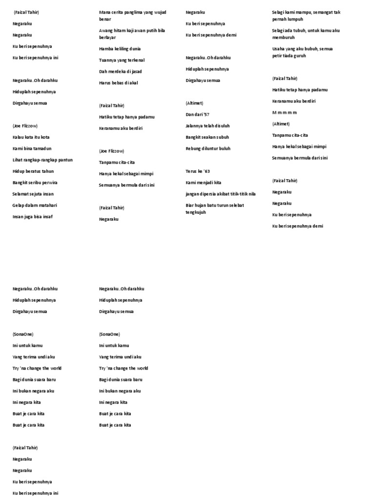 Negaraku tanah tumpahnya darahku, rakyat hidup bersatu dan maju, rahmat bahagia tuhan kurniakan, raja kita selamat bertakhta Malaysia faizal tahir official lyric video. Jika ini kurang cocok silahkan pilih hasil yang ada dibawah ini. Aku negaraku lirik with chords. Lagu adalah ciptaan komposer audi mok dan lirik oleh shazree ishak.